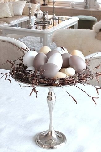 …vagy egyszerűen csak tegyük tele madártollakkal, virágokkal, és díszítsük apró tojásokkal..